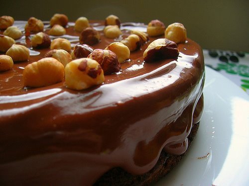 - Κατεβάζετε τη κατσαρολίτσα από τη φωτιά και συνεχίζετε το ανακάτεμα μέχρι να μισοκρυώσει το γλάσο. Μεταφέρετε προσεκτικά το κέϊκ από τη σχάρα που κρυώνει σε πιατέλα. το περιχύνετε με το γλάσο σοκολάτας και προσθέστε από πάνω τα καβουρντισμένα φουντούκια.