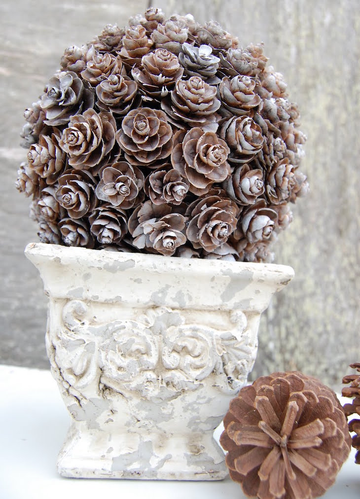 Ένα πανέμορφο διακοσμητικό για το τραπέζι ή σε μια γωνιά του σπιτιού. Χρησιμοποιώντας θερμόκολλα, κολλήστε μεταξύ τους κουκουνάρια σε σχήμα σφαίρας.