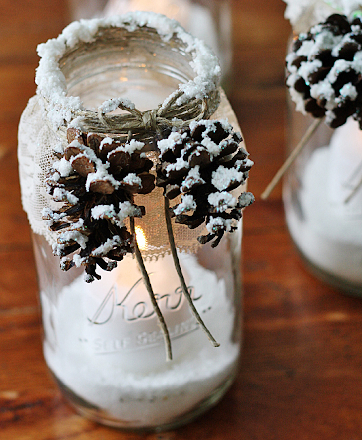 2. Βαζάκια με ψεύτικο χιόνι και κουκουνάρια