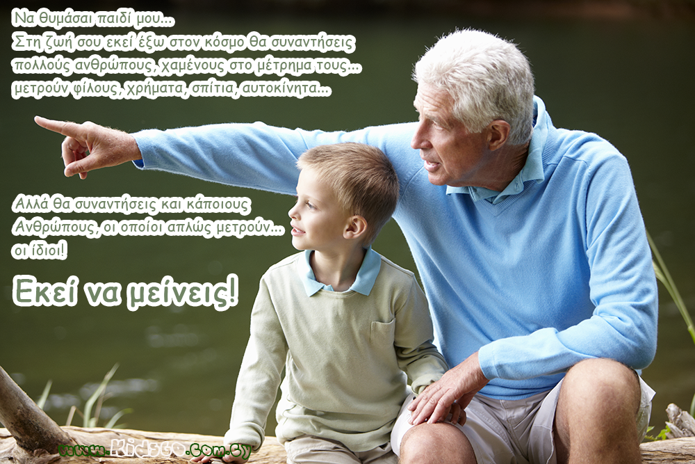 10. Να θυμάσαι παιδί μου… Στη ζωή σου εκεί έξω στον κόσμο θα συναντήσεις πολλούς ανθρώπους, χαμένους στο μέτρημα τους… μετρούν φίλους, χρήματα, σπίτια, αυτοκίνητα… Αλλά θα συναντήσεις και κάποιους Ανθρώπους, οι οποίοι απλώς μετρούν… οι ίδιοι! Εκεί να μείνεις!