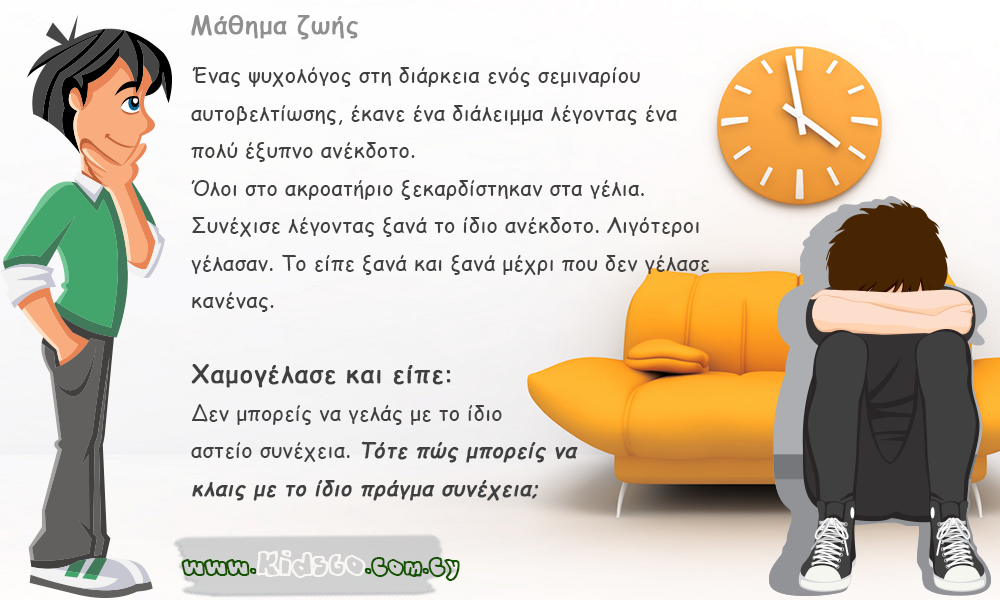 11. Ένας ψυχολόγος στη διάρκεια ενός σεμιναρίου αυτοβελτίωσης, έκανε ένα διάλειμμα λέγοντας ένα πολύ έξυπνο ανέκδοτο. Όλοι στο ακροατήριο ξεκαρδίστηκαν στα γέλια. Συνέχισε λέγοντας ξανά το ίδιο ανέκδοτο. Λιγότεροι γέλασαν. Το είπε ξανά και ξανά μέχρι που δεν γέλασε κανένας.