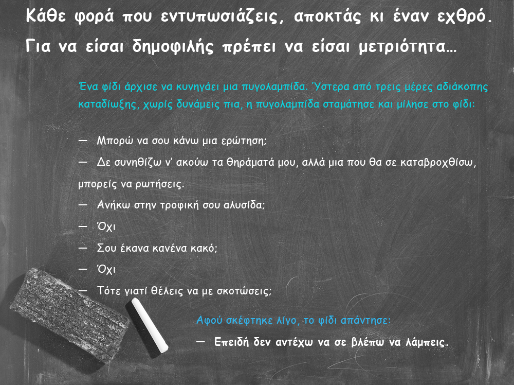 18. Ένα φίδι άρχισε να κυνηγάει μια πυγολαμπίδα. Ύστερα από τρεις μέρες αδιάκοπης καταδίωξης, χωρίς δυνάμεις πια, η πυγολαμπίδα σταμάτησε και μίλησε στο φίδι: