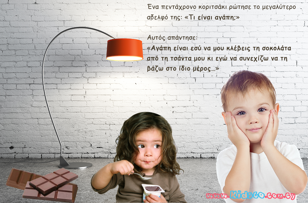 7. Ένα πεντάχρονο κοριτσάκι ρώτησε το μεγαλύτερο αδελφό της: «Τι είναι αγάπη;» Αυτός απάντησε: «Αγάπη είναι εσύ να μου κλέβεις τη σοκολάτα από τη τσάντα μου κι εγώ να συνεχίζω να τη βάζω στο ίδιο μέρος…»