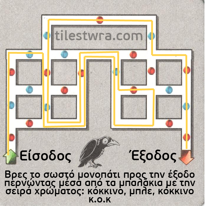 Το πρόβλημα φαίνεται απλό. Ξεκινάτε από αριστερά στην “Είσοδο” και θέλετε να βγείτε από την “Έξοδο”. Επιλέγετε το σωστό μονοπάτι περνώντας μέσα από τα μπαλάκια. Προσοχή όμως, μπορείτε να περνάτε μέσα από τα μπαλάκια μόνο με τη σωστή σειρά χρώματος που είναι η εξής: κόκκινο, μπλε, κόκκινο, μπλε κ.ο.κ. Επίσης μπορείτε να περάσετε μέσα από κάποιο μπαλάκι παραπάνω από μία φορά, αρκεί να τηρείται η σωστή σειρά χρώματος.