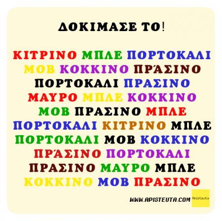 Μετά τα Μαθηματικά και ψυχολογικά Τεστ δημιουργήσαμε ένα ακόμη το οποίο ίσως σας μπερδέψει λίγο. Αυτό που έχετε να κάνετε είναι να διαβάσετε όσο πιο γρήγορα μπορείτε τα παρακάτω χρώματα. Πολλοί δεν τα κατάφεραν και μπερδευτήκαν. Εσύ θα τα καταφέρεις;