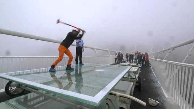 in Βίντεο Να τι συνέβη όταν ρεπόρτερ του BBC προσπάθησε να σπάσει γυάλινη γέφυρα με βαριοπούλα (VIDEO)