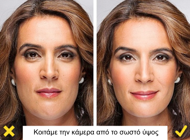 Κοιτάζοντας ελαφρώς από κάτω προς τα πάνω γινόμαστε πιο προσιτοί και ελκυστικοί. Αντίθετα όταν το πρόσωπο είναι πάνω από την κάμερα δείχνουμε πιο επιθετικοί.