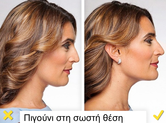 Όταν το πιγούνι είναι επάνω, το πρόσωπο φαίνεται πιο εκφραστικό. Αυτό το τέχνασμα κάνει τον λαιμό πιο εντυπωσιακό και τα μάγουλα να φαίνονται μικρότερα.