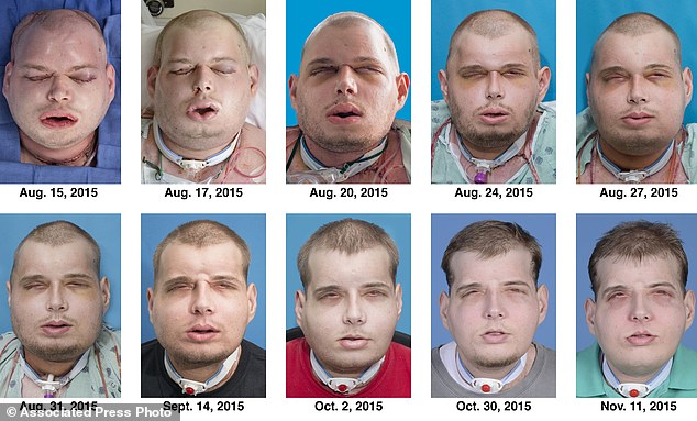 This combination of Aug. 15, 2015 to Nov. 11, 2015 photos provided by the New York University Langone Medical Center shows the recuperation of Patrick Hardison after his facial transplant surgery in New York. Hardison was burned Sept. 5, 2001, in Senatobia, Miss. A 27-year-old father of three at the time who'd served for seven years as a volunteer firefighter, he entered a burning house to search for a woman. The roof collapsed, giving him third-degree burns on his head, neck and upper torso. (Mary Spano/Eduardo D. Rodriguez/Wyss Department of Plastic Surgery/NYU Langone Medical Center via AP)