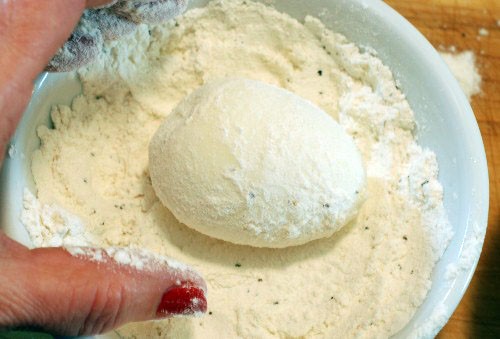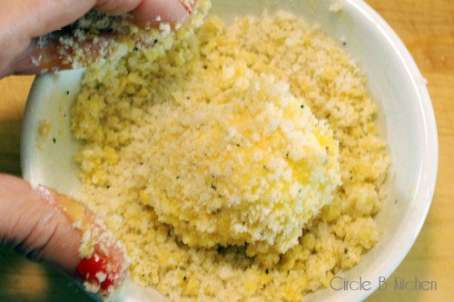 - Τοποθετούμε 3 μπωλ, ένα με το αλεύρι, ένα με το χτυπημένο αυγό και ένα με τη φρυγανιά (στην οποία ρίχνουμε το αλατοπίπερο).