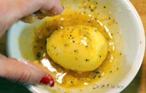 - Παίρνουμε ένα-ένα αυγό και το περνάμε με αλεύρι, με το χτυπημένο αυγό και τέλος με τη φρυγανιά. Το ξαναπερνάμε στο χτυπημένο αυγό και στη φρυγανιά, για να θωρακιστεί καλύτερα η κρούστα.