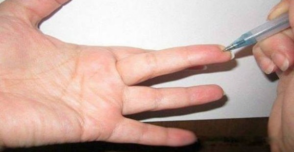 Το σημείο είναι για το μεσαίο δάχτυλο του αριστερού και του δεξιού χεριού σας. Θα πρέπει να το πιέσετε, με ένα στυλό, για παράδειγμα, και κρατήστε το εκεί όπως φαίνεται στην εικόνα με την μύτη του στυλό. Είναι βασανιστικά επώδυνο!