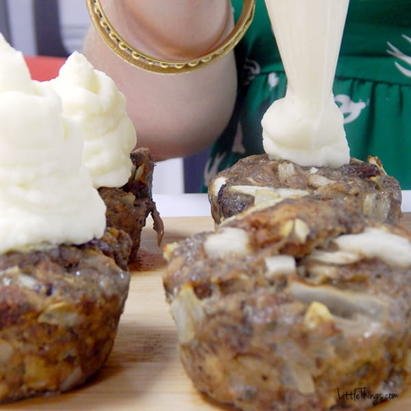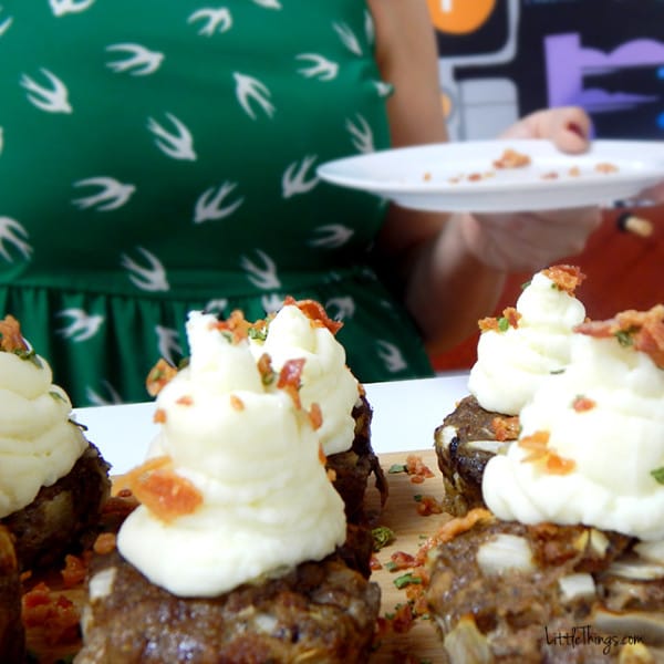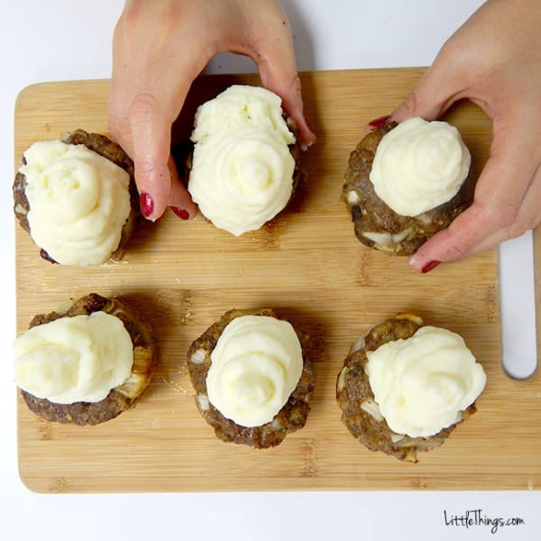 Μόλις βγάλουμε τις μπουκίτσες από τον φούρνο, τις αφήνουμε λίγο να κρυώσουν και μετά γαρνίρουμε από πάνω τον πουρέ και φυσικά το μπέικον!