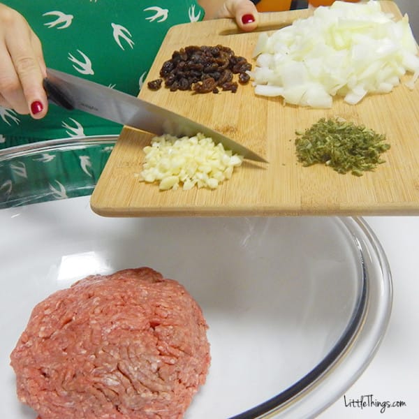 Το αφήσαμε στην άκρη να κρυώσει και συνεχίσαμε με τον κιμά: προσθέτουμε το σκόρδο, το κρεμμύδι, τις σταφίδες και το φασκόμηλο στο μπολ που έχουμε το κρέας και φυσικά αλατοπίπερο.