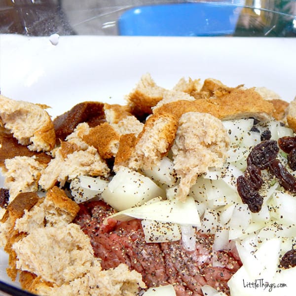 κιμά βοδινό 1 μεγάλο αυγό 1 κρεμμύδι ψιλοκομμένο 4 σκελίδες ψιλοκομμένο φρέσκο σκόρδο 4 φέτες ψωμί ολικής αλέσεως 2-4 κουταλάκια φασκόμηλο 2 κουταλάκια σταφίδες