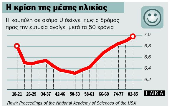 Για την ηλικία, τέλος, µια σειρά από πρόσφατες µελέτες καταλήγουν στο συµπέρασµα ότι η ψυχολογική ευµάρεια είναι µια καµπύλη που έχει το σχήµα του λατινικού γράµµατος U. Ετσι, ο άνθρωπος στα 20 του χρόνια αισθάνεται ψυχολογικά ακµαίος και πιάνει… πάτο στα 46. Υστερα όµως έρχεται η ευτυχία…