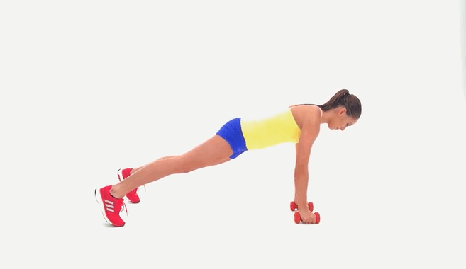 Εδώ τώρα θα χρειαστεί να κρατήσεις και δύο αλτήρες των δύο κιλών, έναν στο κάθε χέρι και να καθίσεις στο πάτωμα σαν να κάνεις plank, στηρίζοντας τα χέρια σου στα βαράκια και έχοντας τα πόδια σου λίγο πιο ανοιχτά από το πλάτος των ώμων.