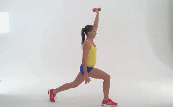 Έπειτα, λύγισε ταυτόχρονα τα γόνατα σου μέχρι το πίσω πόδι να ακουμπήσει στο πάτωμα και σήκωσε τον αλτήρα προς το ταβάνι, μέχρι το πίσω πόδι σχεδόν να τεντώσει.