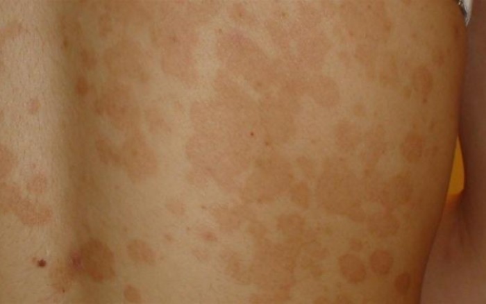 Τα χαρακτηριστικά της είναι καφεγαλακτόχροες ή καφέ κηλίδες ποικίλου μεγέθους, που αφήνουν μεταξύ τους ανοιχτόχρωμες, αποχρωματισμένες ζώνες μετά την έκθεση στον ήλιο.