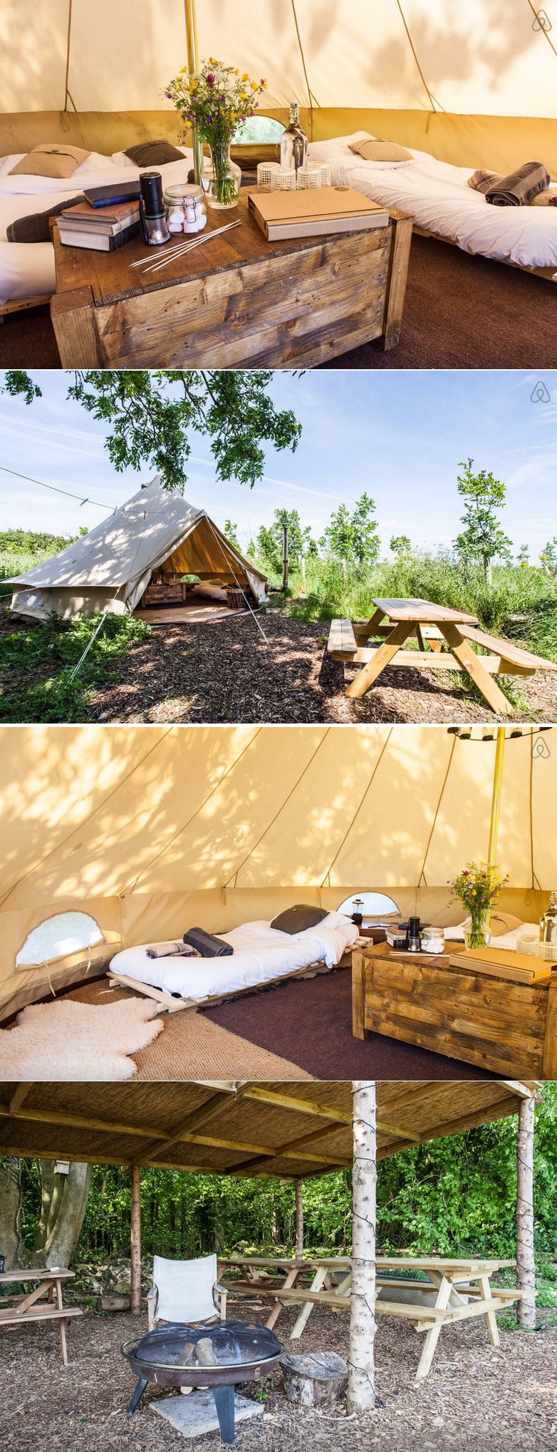 Είναι λοιπόν έξω από την πόλη του Bath, στην Αγγλία, και κοστίζει 124 ευρώ το βράδυ για να μείνετε στη σκηνή. Έχει κάποιες παροχές, όπως μια μικρή κουζινούλα και τουαλέτα, και είναι για 2 άτομα. Εντάξει, είναι πολύ όμορφη και καλόγουστη, όμως δεν παύει να είναι απλώς μια σκηνή στο ύπαιθρο… Θα σας έχουν όμως και λουλούδια στο βάζο!