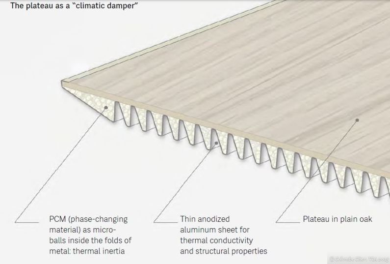 Κάτω από το τραπέζι οξιάς υπάρχουν σειρές από υλικό με σημείο τήξης 22° Κελσίου. Όταν η θερμοκρασία φτάνει τους 22 βαθμούς κελσίου τα μικροσφαιρίδια απελευθερώνουν την θερμότητα, με την βοήθεια του αλουμινίου που έχουν στην βάση τους και ρίχνουν την θερμοκρασία του δωματίου.